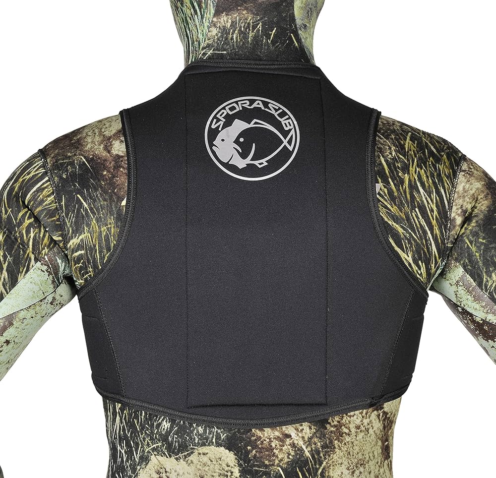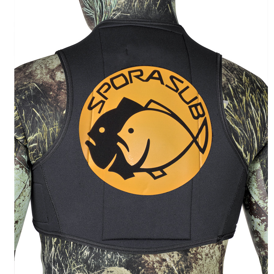 Le cercle orange (orange ou noir) au niveau du dos permet, en surface, de se signaler au éventuels bateaux et autres, en plus des signalements obligatoires (drapeau et / ou = bouée).