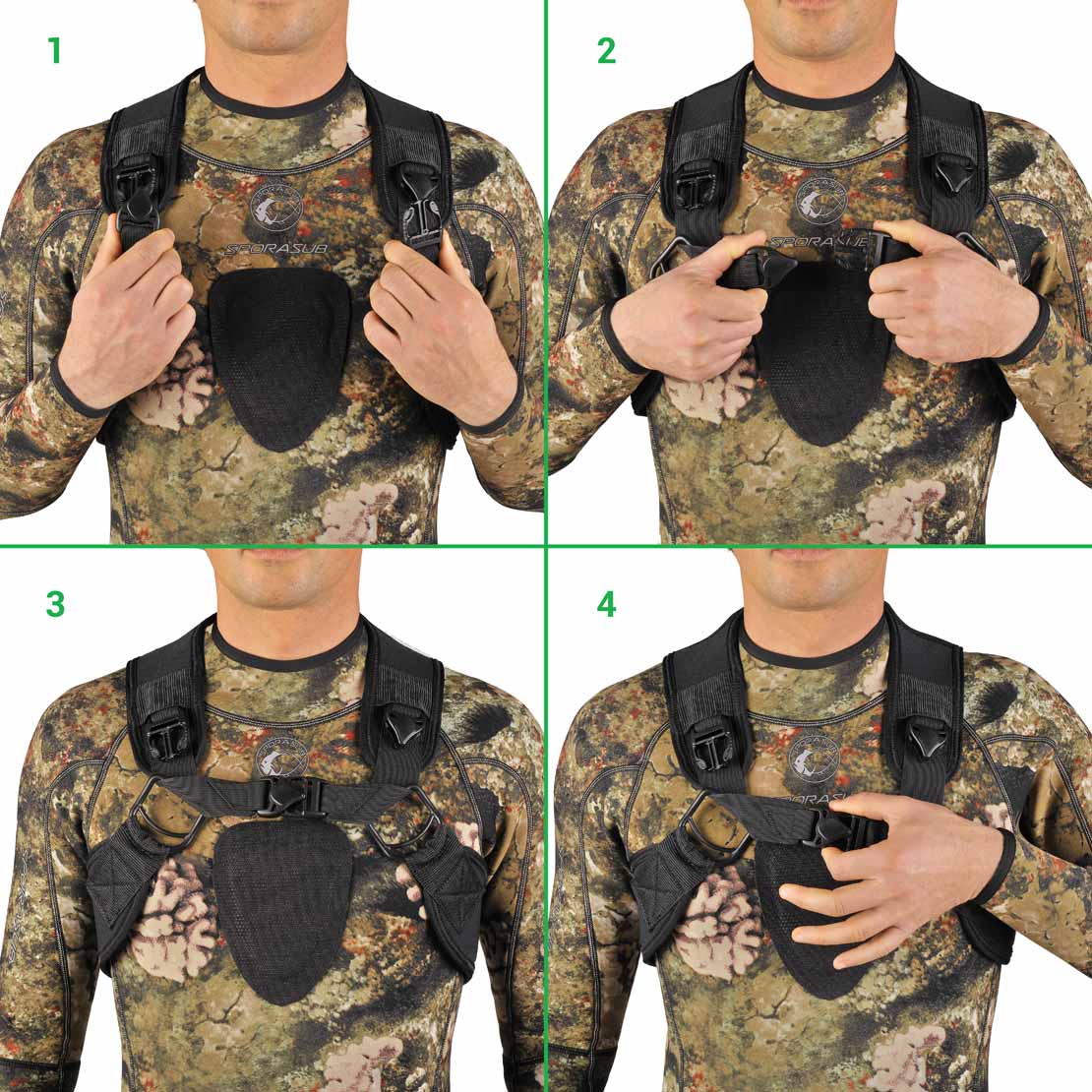 Ce gilet porte-plomb est caractérisé principalement par un système de larguage qui, une fois mis en place, permet de larguer ce gilet d’un simple geste (pour des raisons de sécurité).
