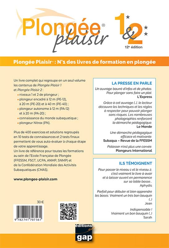 Un livre qui rend accessibles toutes les connaissances nécessaires à l’apprentissage de la plongée sous-marine : initiation et perfectionnement. Ce livre est l’ouvrage de référence de la FFESSM, pour l’ensemble des formations de plongeurs niveau l et niveau 2. Cela va bien au-delà d’une simple labellisation. Il s’agit du livre que la FFESSM conseille à l’ensemble des pratiquants niveau 1 et niveau 2, aux clubs affiliés et centres agréés ainsi qu’aux moniteurs pour les aider dans leurs formations quotidiennes Bonus : Tests de connaissances – 300 exercices et solutions – Livré avec Brochure Tables de Plongée FFESSM Le néophyte et l’initié trouveront ici un support pédagogique efficace et attrayant, simple et complet, tout en laissant une large part au rêve, à l’évasion. Soucieux de préserver la motivation du lecteur, Alain FORET et Pablo TORRES présentent progressivement les apports techniques et théoriques, illustrés par plus de 400 photographies et 100 schémas originaux. Du niveau 1 au niveau 2, les plongeurs pourront y puiser tous les éléments nécessaires à leur formation, aidés en cela par de nombreux tests de connaissances qui ponctuent l’ouvrage. Passé cette phase, face à de nouvelles attentes plus culturelles que techniques, les superbes photographies sur le monde sous-marin deviennent une véritable incitation à la plongée.